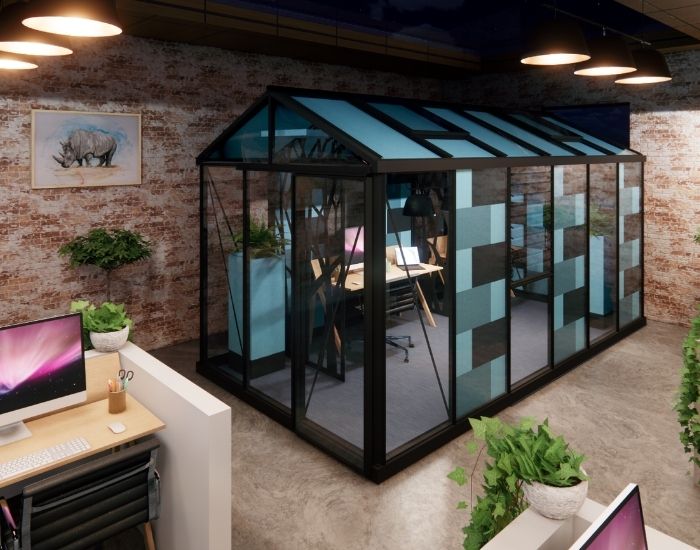 Glazen kantoorkassen, omlijst met robuust aluminium, vangen het oog en inspireren de geest. De transparantie nodigt natuurlijk licht uit en omarmt het groen, terwijl de akoestische verbeteringen zorgen voor een serene werkplek. Van het lichte model in blank aluminium tot het donkere model voor een moderne flair; elke kas is aan te passen naar uw wensen.